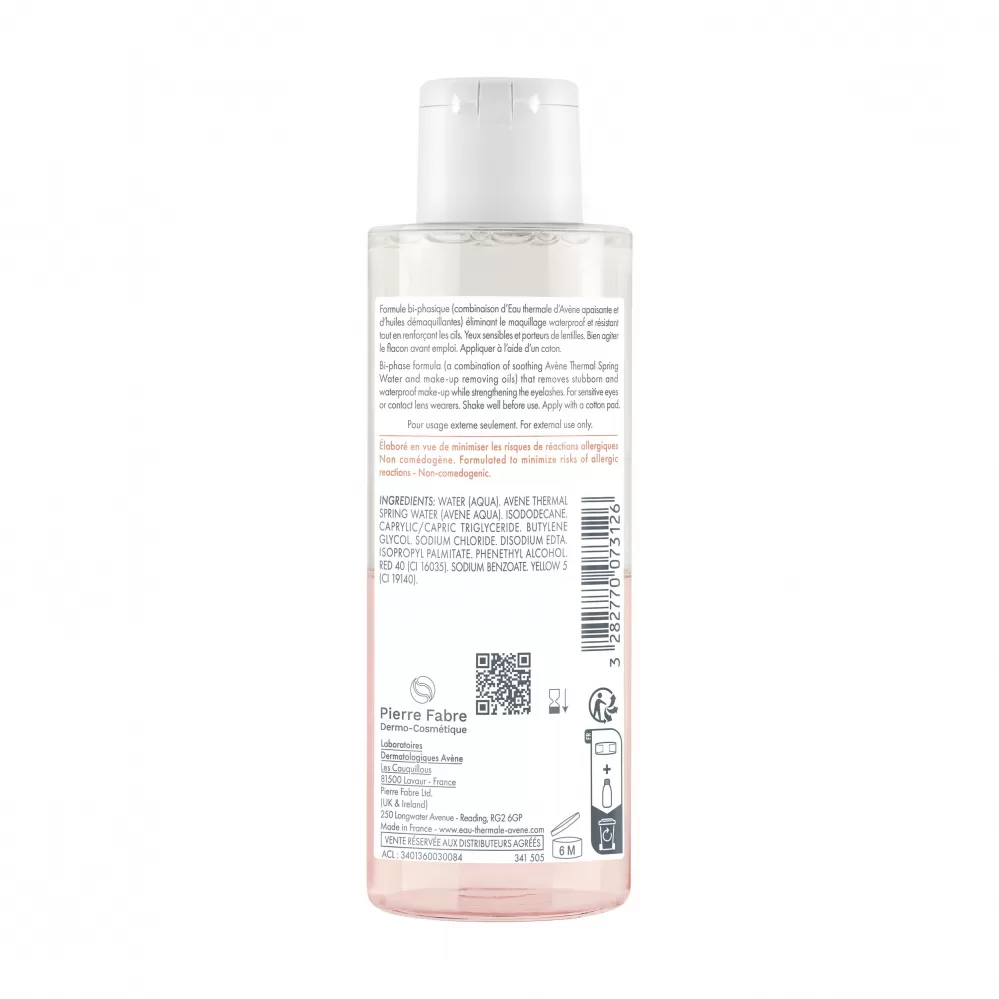 Nekomedogenní dvoufázové složení odličovače zajišťuje spolehlivé a důkladné odstranění veškerého make-upu z očního okolí, aniž by oči byly namáhány nebo došlo k jejich podráždění. O zklidnění citlivé a jemné pokožky se postará přírodní termální voda z Avéne. Ta je zde zkombinovaná se speciální směsí olejů, které slouží k odstranění odolného make-upu a posílení řas.