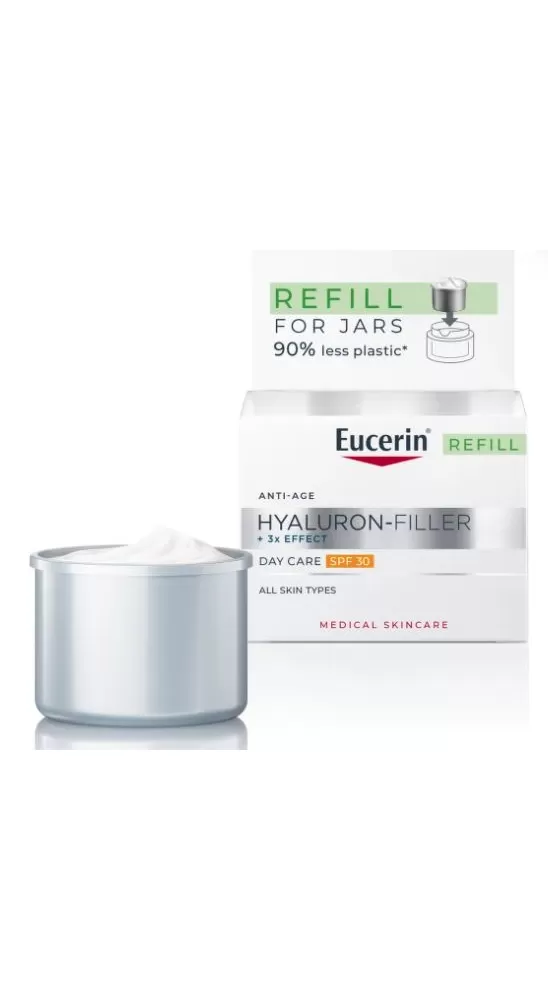 Eucerin Hyaluron-Filler + 3× Effect Denní krém SPF 30 je nyní dostupný i ve formě ekologičtější náhradní náplně. Tato varianta je ideální pro všechny, kdo chtějí pokračovat v osvědčené péči o pleť a zároveň snížit množství odpadu. Krém si zachovává všechny benefity původního a poskytuje komplexní anti-age péči díky jedinečnému složení se třemi klíčovými aktivními látkami: kyselinou hyaluronovou, glycin saponinem a enoxolonem.