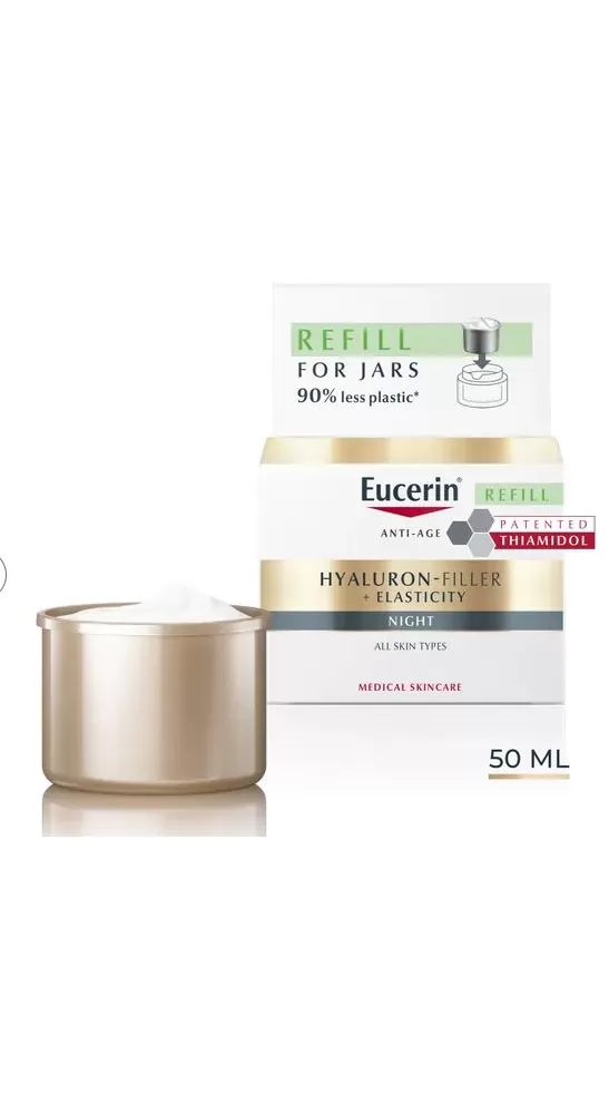 Eucerin Hyaluron-Filler+Elasticity noční krém navrací pleti mladistvý vzhled. Vyhlazuje vrásky a zjemňuje pigmentové skvrny. V udržitelnější formě náhradní náplně.