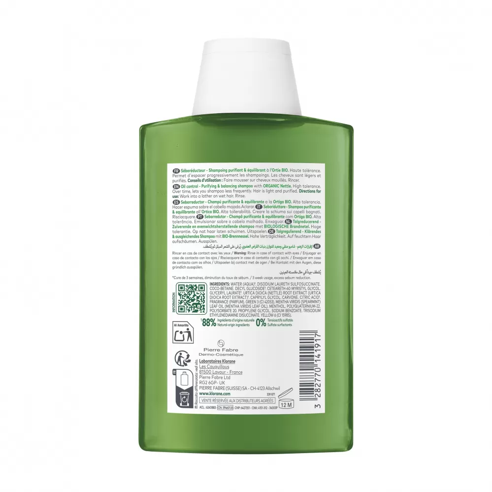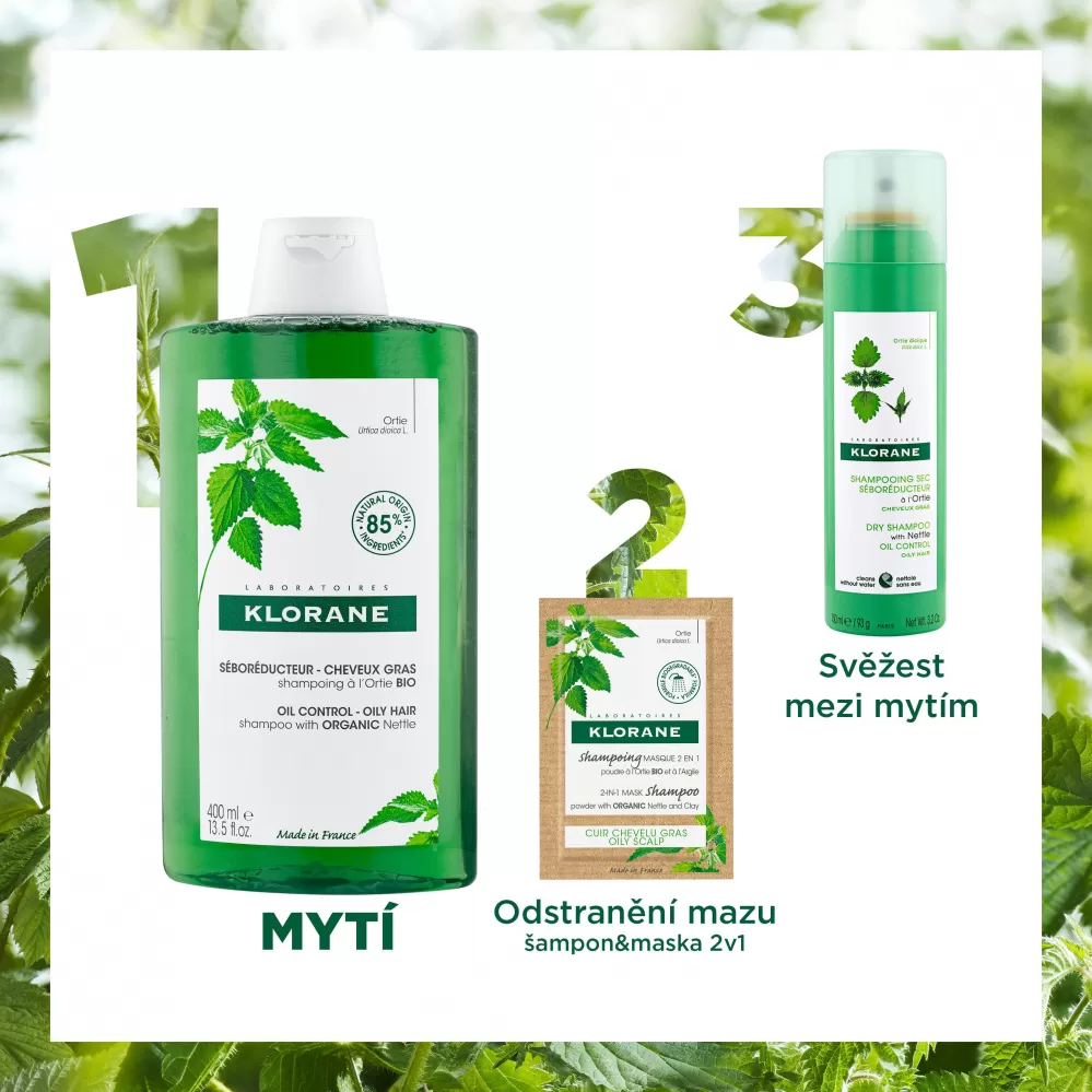 Klorane seboregulační šampon obohacený o výtažek z kopřivy splňuje potřeby mastných vlasů. Díky mycí bázi, která respektuje přirozenou rovnováhu vlasové pokožky, účinně čistí a zároveň snižuje tvorbu kožního mazu, takže vlasová pokožka je čistá a vlasy zůstávají déle lehčí*. Za tento absorpční účinek šampon vděčí regulačním a čisticím schopnostem kopřivy, která dokáže redukovat tvorbu kožního mazu. Po aplikaci je vlasová pokožka pročištěna a vlasy zůstanou vzdušné, což umožní snížit frekvenci mytí vlasů.
