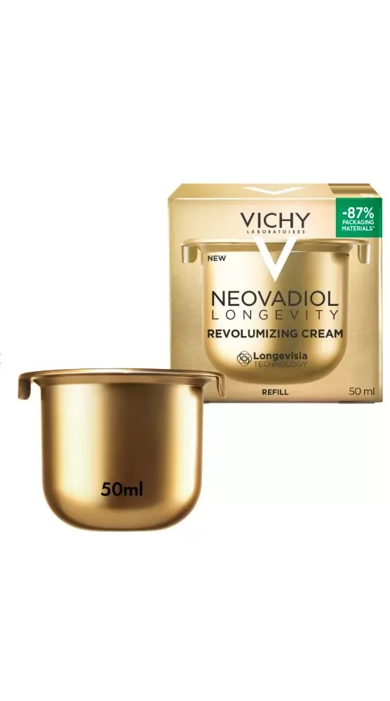 VICHY NEOVADIOL LONGEVITY revitalizační krém s obsahem 13% Proxylane-Longevity Technology™ [Proxylane + Niacinamid + Senevisium], která pomáhá stimulovat vlastní schopnost pleti obnovovat všechna strukturální vlákna.* Textura je jemná na dotek a po kontaktu s pokožkou se rozpouští a zanechává hedvábný pocit. Pleť je okamžitě vyživená a zářivá.