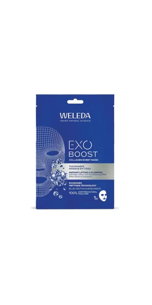 EXO BOOST Kolagenová maska je intenzivní textilní maska napuštěná sérem, která kombinuje Collagen+ Active Complex s inovativní EXOSOMES PEPTIDES TECHNOLOGY z pupečníku asijského (Centella Asiatica). Collagen+ Active Complex spojuje bio modrý hořec, bio protěž alpskou a pupečník asijský (Centella Asiatica), rostlinné složky známé svou schopností podporovat pevnost a odolnost pleti.