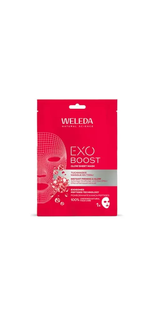 Dopřejte pleti 15 minut, které jsou vidět. EXO BOOST Zpevňující maska je intenzivní textilní maska napuštěná sérem, navržená pro okamžitý efekt i dlouhodobou podporu pevnosti pleti. Spojuje antioxidační sílu granátového jablka a maca peptidů s inovativní EXOSOMES PEPTIDES TECHNOLOGY z pupečníku asijského (Centella Asiatica).