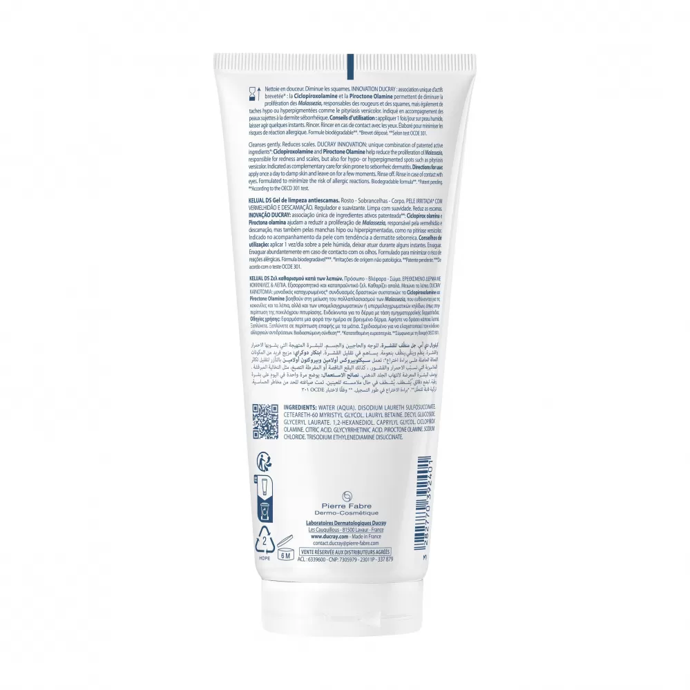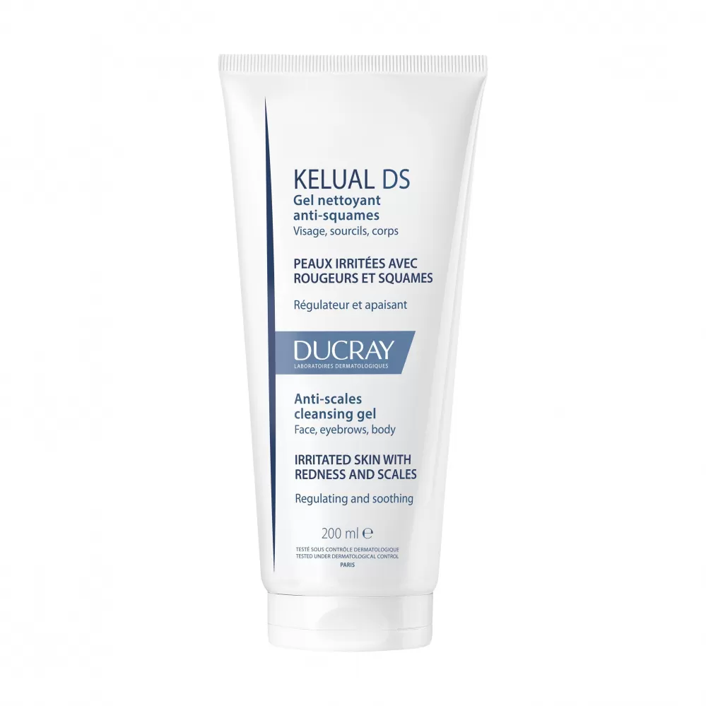 DUCRAY Kelual DS čisticí gel snižující množství šupin zklidňuje podrážděnou pokožku se začervenáním a šupinatěním (malé šupinky kůže, které se odlupují). Díky patentované kombinaci aktivních látek Ciclopiroxolaminu a Piroctonokaminu reguluje nadměrné množství kvasinek Malassezia, které jsou zodpovědné za začervenání, šupinky a svědění, stejně jako za pigmentové skvrny, jako je pityriasis versicolor.