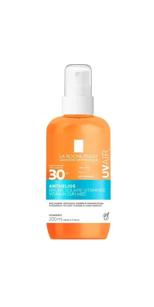 LA ROCHE-POSAY ANTHELIOS UV AIR VITAMIN ochranná opalovací mlha SPF30 se sametovým finišem. Transparentní mlha. Odolná vůči vodě a potu. Pomáhá osvěžovat pokožku a pomáhá hydratovat až po dobu 8 hodin po jedné aplikaci. * Pomáhá chránit kožní bariéru.* Pleť působí zářivě se sametovým finišem.** Snadná aplikace, rychle schnoucí.** Nezanechává skvrny na oblečení. Vhodná pro citlivou pokožku.