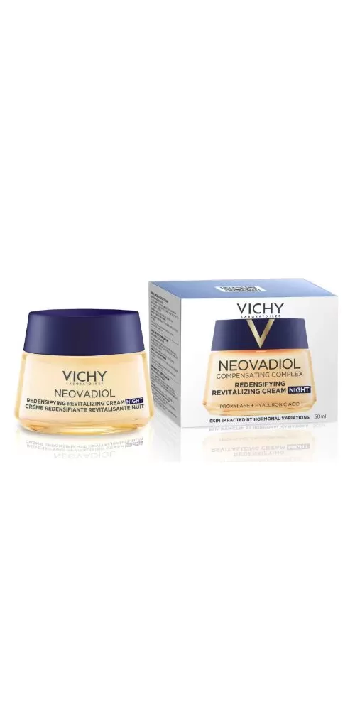 Hormonální změny v období kolem menopauzy urychlují stárnutí pleti, která ztrácí elasticitu a hutnost. Laboratoře Vichy proto vyvinuly Vichy Neovadiol Perimenopauza noční krém, který pomáhá kompenzovat dopady perimenopauzy na vzhled pokožky. Při pravidelném používání zanechá krém Vaši pleť hutnější, vyplněnou a navratí jí zářivý vzhled.