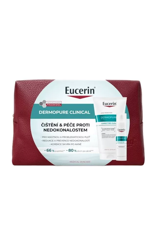 Eucerin® DermoPure CLINICAL fluid s trojitým účinkem je inovativní přípravek pro komplexní péči o mastnou pleť se sklonem k akné. Jeho speciální složení s 2% kyselinou salicylovou a patentovaným thiamidolem účinně bojuje proti třem hlavním typům nedokonalostí pleti.